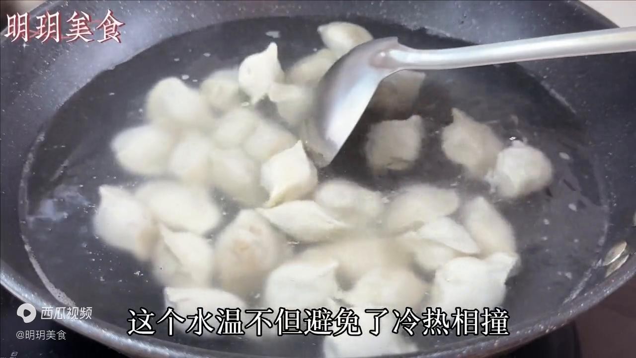 8. 相信很多朋友都听过一句老话:三开饺子两开面。意思就是煮饺子的时候水要三点三开,共三次,这样煮的饺子不容易破皮,也不会加深。再次展开后再往里边加入少许的冷水,缓冲一下水的温度。之所以说经过点水后煮熟的饺子一定不会加生,因为饺子是比较热的,加入冷水之后就会产生热胀冷缩。利用这个原理让热量快速进入到饺子线中,让饺子馅熟的更快,而且也不容易把皮煮破。当锅中水再次展开后再次点水,这就是第三次点水了。饺子煮至浮起水再次长,再煮一分钟就可以了。锅中水开后先盛出一两勺,加入碗中吊个汤底,搅拌搅拌,鲜香美味。