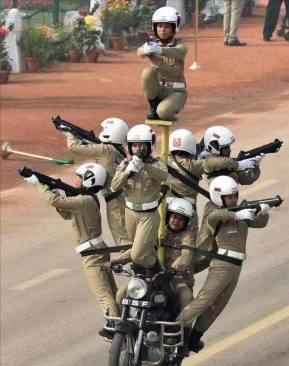 另一个四川网友直接发出印军阅兵的摩托车杂技图片:从这里都能看出印度人为什么喜欢超载——一个摩托车上能装十几个印度士兵。