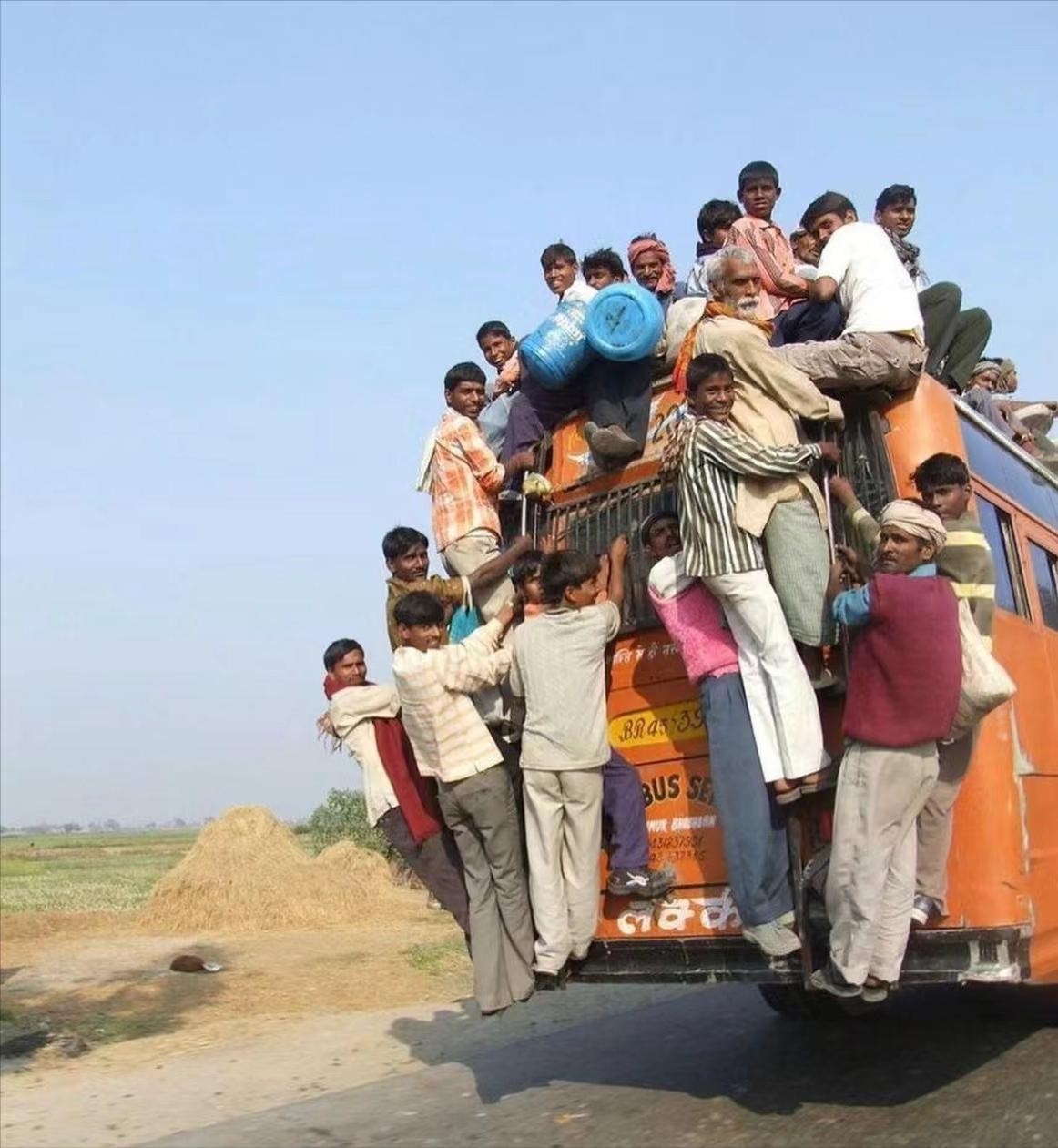 这种画面在印度太正常不过了:这种大巴车外面挂满乘客的奇葩景象,估计只有在印度才能看得到。