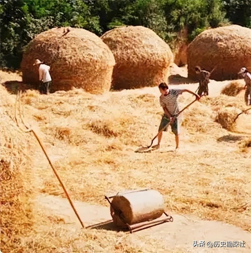 这样的场景那时候的人应该都比较熟悉,这是那时候打场的场景,图中滚轮一样的物件就是石磙,从田地里收获的粮食,会被铺放在稻谷场上晒太阳,让里面的水分蒸发掉。