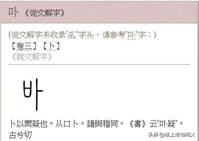 (卟)⺊㠯問疑也。左傳曰:⺊以決疑,不疑何⺊。問疑,故從口。俗作乩。从口⺊。當作⺊口,⺊而以口問也。凡若此等未能盡正,學者於此例之,可以三隅反矣。讀與稽同。古兮切。十六部。按小徐曰:尙書曰明用卟疑,今文借稽字。徐語肊說耳。尙書無作卟疑者。卽有之,亦陸氏所謂穿鑿之徒務欲立異者也。大徐乃於同下沾書云卟疑四字。疑惑後生,其亦妄矣。
