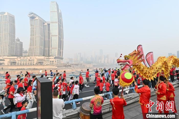 图为2024重庆马拉松赛现场,舞龙队伍为选手加油助威。中新网记者 何蓬磊 摄