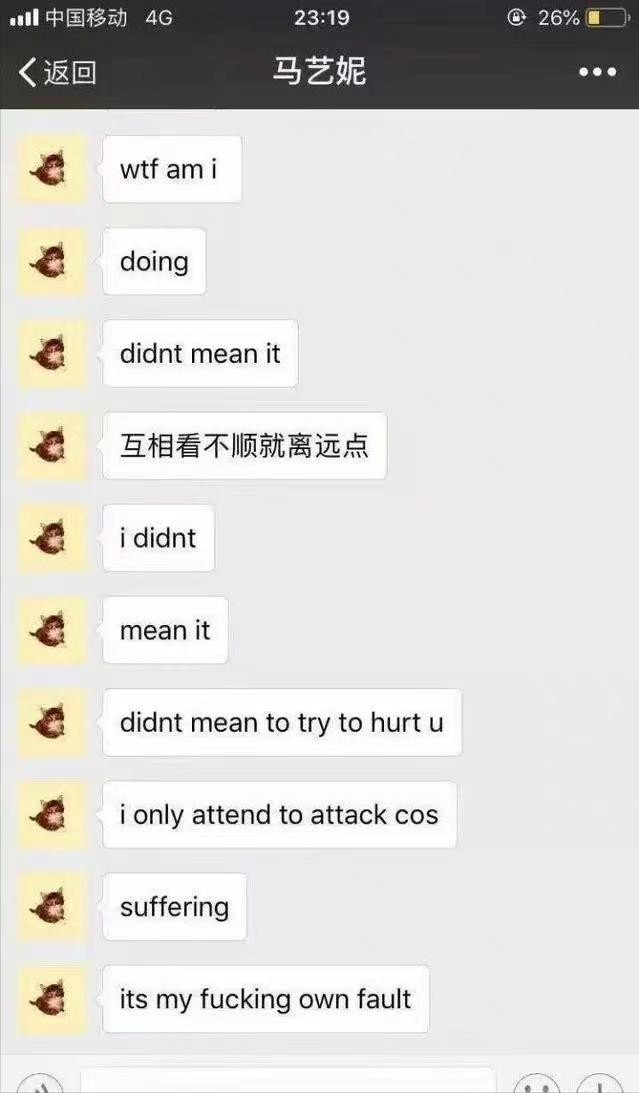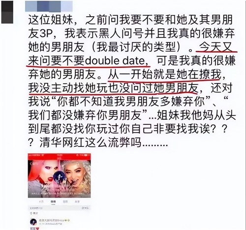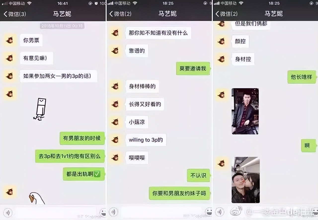 有来自北大的学妹在朋友圈爆料,马艺妮与她交流,称问她要不要加入到她和他男朋友的生活中来,晚上则是多人运动。学妹拒绝了这个无理的要求。但是在随后的第二天,马艺妮依然联系学妹,并说三人不行,可以有其他的方式。在第二次遭到学妹的拒绝后。马艺妮就开始诋毁学妹,说她的男朋友完全看不上她,她在这里拽个什么劲。学妹被马艺妮惊人的回答震惊不已,马艺妮随后就开始狂骂这位学妹。学妹就将此事发到了朋友圈上。