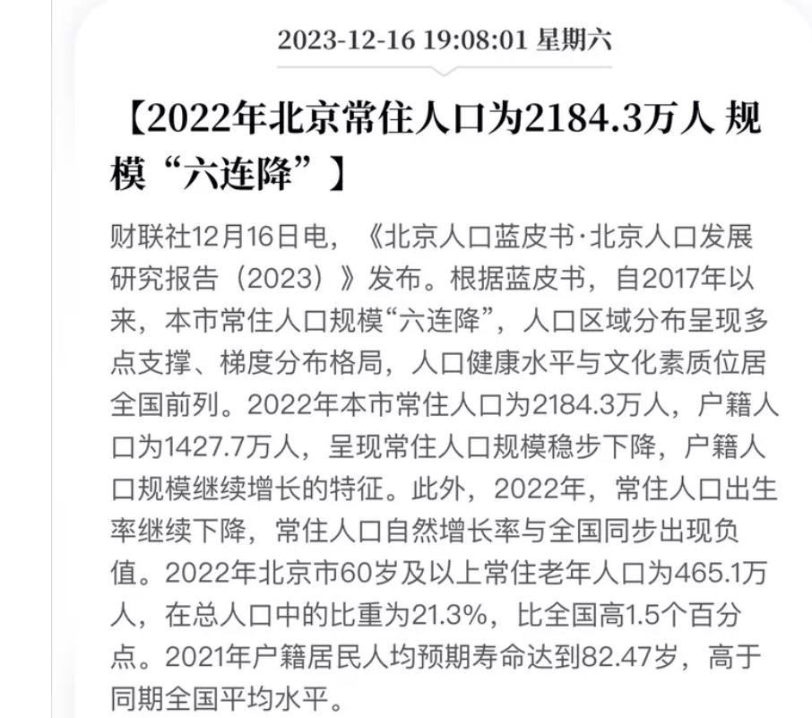 第四 北京人口出生下降,导致北京本地新增加人口减少。