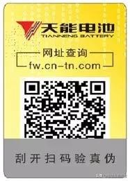 天能正品电池,每组电池包装箱侧面都有防伪标签。每组电池对应唯一的防伪标签,且只能使用一次。