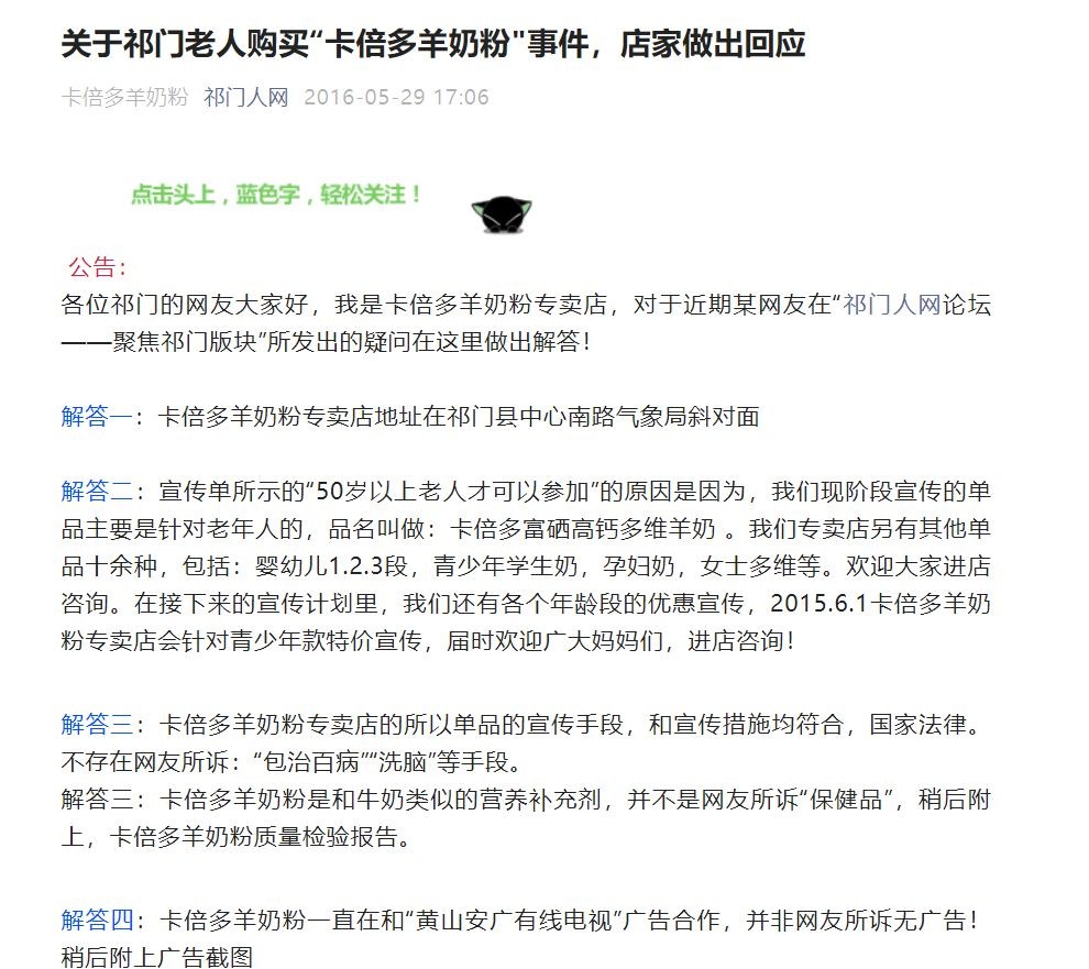 对于媒体的曝光和消费者的投诉,该企业也曾回复称,卡倍多羊奶粉专卖店的宣传手段和宣传措施均符合国家法律。不存在网友所诉“包治百病”“洗脑”等手段,希望发表不实言论网友能进店详细了解。并表示会附上卡倍多羊奶粉质检报告。