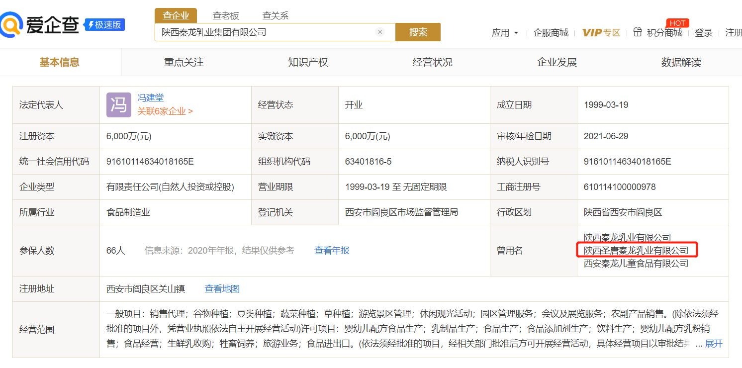 据爱企查信息,陕西秦龙乳业有限公司曾用名为“陕西圣唐秦龙乳业有限公司”,公司原名使用日期为2010年9月至2016年9月,这段时间对于秦龙乳业而言,是一段“黑历史”。