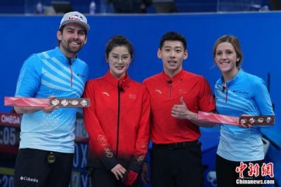 - 范苏圆和凌智打几球(凌智赛后送给美国选手礼物) 图为范苏圆、凌智赛后与美国选手合影。中新社记者崔楠摄 中新网北京2月5日电(记者 陈杭)5日举行的北京冬奥会冰壶混双循环赛中...